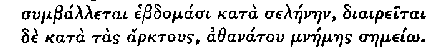 page 375 note 1 The Chinese used the Bear's attitude as a guide to the seasons (Ginzel ap. Roscher [1911], p. 77; Holmberg, U., Der Baum des Lebens, p. 6Google Scholar), but the Greeks always use risings and settings. The moon and Bears perhaps occur in connection with a heptad of seasons in Heraclitus fr. 118 M. (B 126a), but the authenticity is very suspect and the meaning very obscure: ![]()