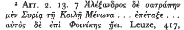 supposes that Arrian was faced with two parallel narratives in his sources, one describing Parmenion's campaign in the interior and the other Alexander's activities in Phoenicia. Arrian decided to concentrate exclusively on Alexander and accordingly pruned down operations in the interior to the bare minimum, recording only the fact of subjugation and the final appointment of Menon. Leuze prudently refrained from adducing parallels, which would have proved difficult. Arrian has no hesitation in breaking his narrative for episodes like the Aegean War (2.1–; 13. 4–; 3. 2. 3–), and, if Parmenion's exploits in Syria had been described by Ptolemy or Aristobulus, there was no earthly reason to have omitted them.