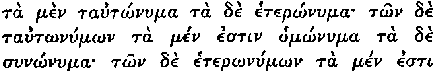 in A 15; and (b) Waitz's argument that the συνώνυµa of A 15 are ‘Speusippan’ depends on his construing the òµώνòµa in the same context as ‘Speusippan’. Waitz, however, is far from clear on this issue; in his notes on the Categories he says in general: ‘definit [sc. Aristoteles] vocum et homonymiam et synonymiam, non rerum’ (i. 272).