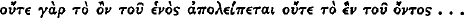 page 33 note 2 Taylor took this clause as a genitive absolute (albeit lacking a verb): ‘whereas the subject of the postulate, the existent one, is self-identical’; but Cornford pointed out that the genitive must be possessive, as in the first clause of the protasis (op. cit. 137, n. I).