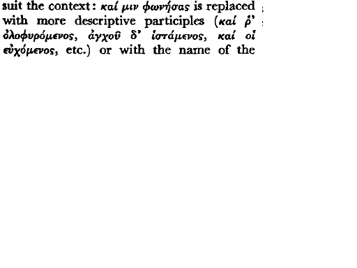 page 9 note 2 The traditional explanation ‘said and called by name’, a hysteron proteron, cannot be right. It makes the meaning very flat. Besides, the proper name very often does not recur in the speech that follows, and, conversely, there are in the poems countless addresses which have the vocative of the person addressed and are not introduced by this phrase. In Od. 21. 248 we even find the phrase introducing a soliloquy, cf. 7. 330. On the contrary, we have a climax: first the simple utterance (‘spoke word’) and then speech made more specific, pressing, personal (‘named’). We may understand