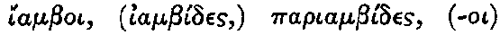 page 310 note 4 Apollod. ap. Hesych. s.v. παριαµβίδєς , are citharistic nomes designed for aulos accompaniment, Epicharmus fr. 109, Pollux 4. 65, 83, Phot. s.v. παρίαµβοι. It should be noted that for Epicharmus ἲαµβοι is a genre that may include anapaests, cf. fr. 88, with Kaibel, C.G.F., p. 87.