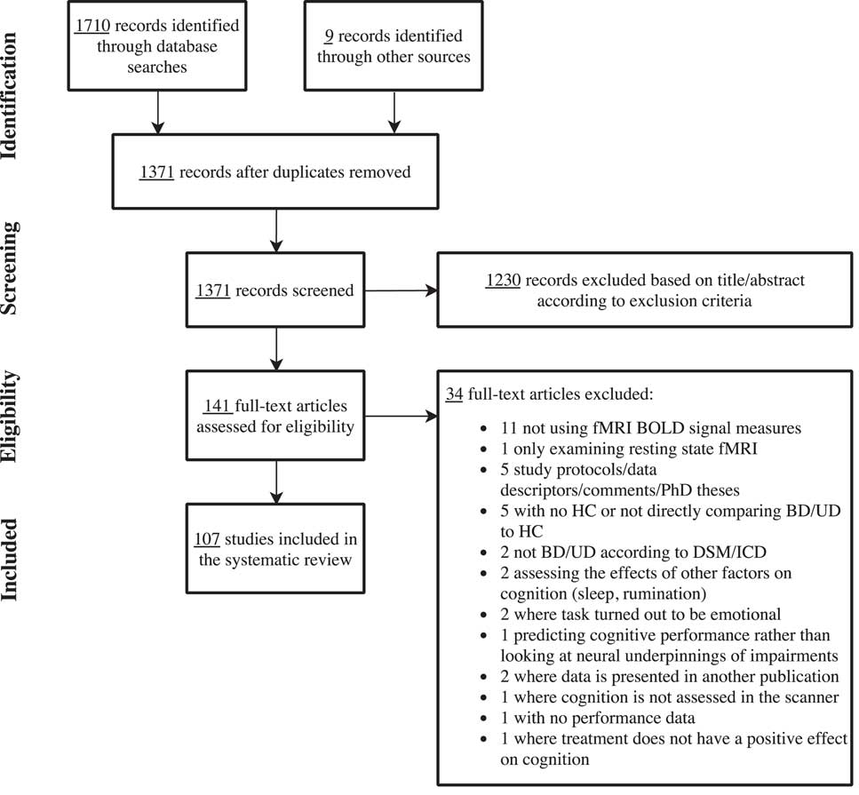 We included original research articles that examined the neural basis of cognitive impairment and/or improvement as measured with fMRI blood-oxygen-level-dependent (BOLD) techniques in adults with UD or BD irrespective of mood state. We excluded articles that (a) were not original (ie, meta-analyses and reviews), (b) were preclinical, (c) did not utilize the fMRI BOLD signal, (d) did not verify a diagnosis of UD or BD with either the Diagnostic and Statistical Manual of Mental Disorders (DSM) 27 or the International Classification of Diseases (ICD), 28 and (e) examined pediatric/adolescent or geriatric populations. Articles were also excluded if (f) organic disease was present (including neurodegenerative diseases, brain tumors, head trauma, and brain surgery); (g) neuroimaging was not related to performance on an objective neuropsychological test; (h) they involved single-case reports; (i) they only relied on resting state fMRI; or (j) they examined the influence of genetic polymorphisms.