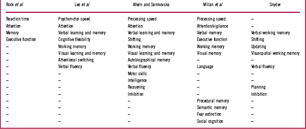 Where possible we have aligned similar domains on the basis of the tests used to describe individual functions. For example, Lee et al Reference Lee, Hermens, Porter and Redoblado-Hodge 12 describe Trail Making Test A performance as a measure of “processing speed,” Ahern and SemkovskaReference Ahern and Semkovska 13 describe it as a measure of “psychomotor speed,” and SnyderReference Snyder 14 lists this measure as a test of “shifting.” SnyderReference Snyder 14 also lists the Wisconsin Card Sorting Test (WCST) as a measure of shifting, whereas for Lee et al Reference Lee, Hermens, Porter and Redoblado-Hodge 12 the WCST is a test of “cognitive flexibility.” All 3 of these authors refer to verbal fluency as a distinct domain, though in the wider neuropsychological community tests of fluency are usually considered to be tests of executive function and language (eg, LezakReference Lezak 19 ).