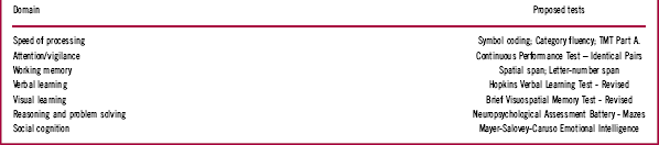 The specification of domains is not peculiar to issues of cognition in depression. A similar enterprise was engaged in by the Measurement and Treatment Research to Improve Cognition in Schizophrenia (MATRICS) group.Reference Green, Nuechterlein and Gold 20 Part of this process was the identification of cognitive domains relevant to presentation and treatment in cases of cognitive impairment associated with schizophrenia (CIAS).Reference Nuechterlein, Green and Kern 21 The cognitive domains identified, together with the measures selected to form their assessment, are shown in Table 2.