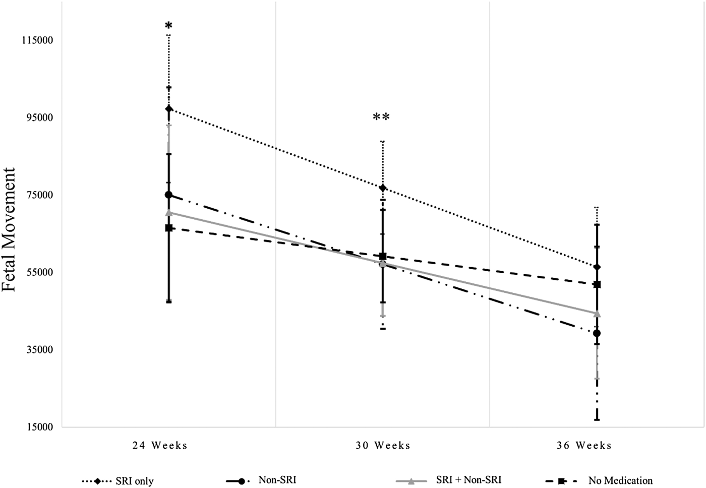 Figure 3. SRI-only use is associated with greater fetal movement. *At 24 weeks, the SRI Only group was significantly higher on fetal movement compared to the No Medication group (p = .02). **At 30 weeks, the SRI Only group was significantly higher on fetal movement compared to the No Medication, SRI + Non-SRI, and Non-SRI groups (p = .03, .03, and .05, respectively).