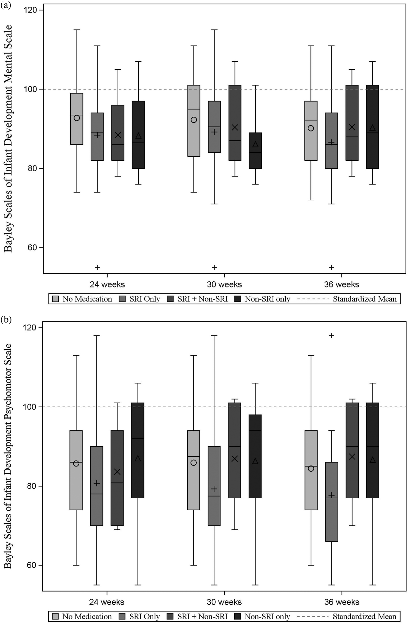 Several reports show significant associations of psychotropic medications with decrements in early infant psychomotor, though not mental, development using the Bayley Scales of Infant Development (BSID) at ages 10–16 months old (Casper et al., Reference Casper, Gilles, Fleisher, Baran, Enns and Lazzeroni2011; Hanley, Brain, & Oberlander, Reference Hanley, Brain and Oberlander2013). However, most of those studies relied on small sample sizes, that is, prenatal exposure groups ranging from 31 to 55 (Casper et al., Reference Casper, Gilles, Fleisher, Baran, Enns and Lazzeroni2011; Hanley et al., Reference Hanley, Brain and Oberlander2013). In a longitudinal study of 166 mother–infant dyads (SRI monotherapy n = 41), untreated major depressive disorder (MDD; n = 27, no exposure n = 98), Santucci et al. (Reference Santucci, Singer, Wisniewski, Luther, Eng, Sit and Wisner2017) showed SRI versus MDD and no exposure was associated with lower BSID psychomotor development at 6.5 and 13 months old; however, these differences were no longer observed at 19.5 months, and the lower scores were within the normal range. There were no findings for the mental development outcomes.
