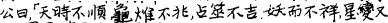 Chapter of Zhoushu, which 1s possibly the same work referred to in Zhuangzi (H-Y index 65/24/8): “When King Wu went east to attack and reached the banks of the Yellow R-iver, it rained heavily and thundered intensely. Dan, Duke of Zhou, came before the King and said, ‘Heaven does not assist Zhou. The Import is that my lord's virtue and comportment are not without flaw, the people are afflicted and complaining. Therefore Heaven sends down calamities on us. I request to withdraw the army.’ Tai Gong (i.e., Lü Shang) said, ‘You may not.’ King Wu and the Duke of Zhou looked in the distance at the ranks of Zhou [Xin's] troops, drew up the army and halted [the advance]. Tai Gong asked, ‘Sire, why do you not have them charge?’ The Duke of Zhou said, ‘The season of Heaven is not with us. Divination by tortoise and firebrand give no sign. The prognostication by milfoil is inauspicious; it is perverse and unfavorable; what Is more, the changes in the stars are baleful. Therefore, [I] Dan halted them. How could they [be allowed to] advance?” ![]()
