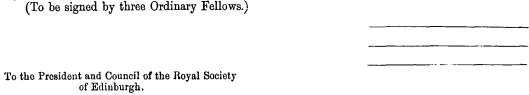 page 710 note * “A. B., a gentleman well versed in Science (or Polite Literature, as the case may be), being “to our knowledge desirous of becoming a Fellow of the Royal Society of Edinburgh, we hereby “recommend him as deserving of that honour, and as likely to prove a useful and valuable Member.”