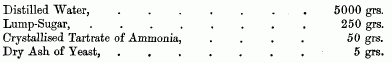 page 323 note * In preparing the liquid I deviated to some extent from Pasteur’s formula, -which is 100 parts distilled water, 10 parts pure sugar candy, 1 part tartrate of ammonia, and the ashes of 1 part of yeast. I employed lump-sugar instead of sugar candy, and reduced its proportion by one half, as it seemed to me likely to prove somewhat too strong to suit some organisms. Further, as I had not at hand a reference to enable me to ascertain how much of the mineral salts Pasteur employed, I used what seemed to me about a suitable amount for a fungus to consume, judging from the quantity that I got by incinerating a certain weight of yeast; and this, as I afterwards found, was a little more than Pasteur’s proportion. My solution, then, had the following composition:—