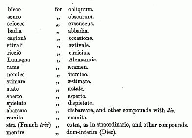 often quoted (C. Lewis' “Romanic Languages,” 2d edit., p. 246) to prove the nearness of Italian to Latin, are no proof of the rule in that language, but are altogether exceptive, as any one may perceive by taking a stanza of Ottava rima either in Tasso or Ariosto, and counting how very few words in the eight lines have retained the unaltered form of the Latin from which they are derived.