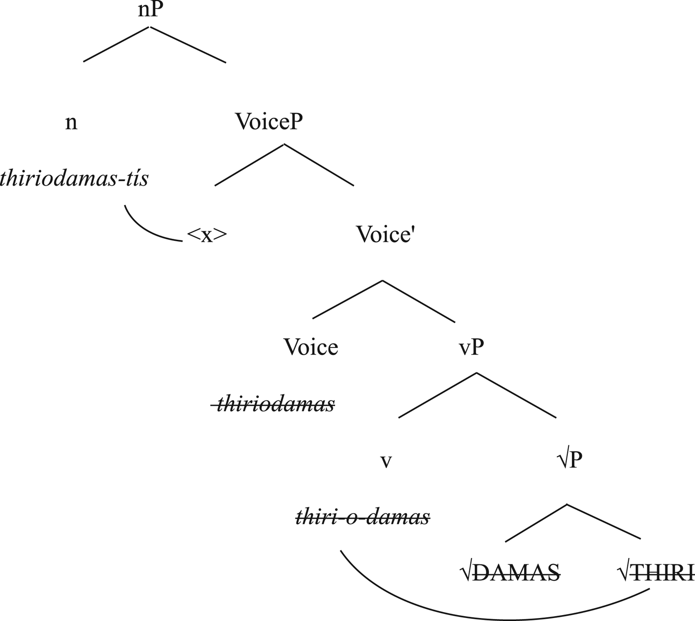 In (34), according to Iordachioaia et al. (Reference Iordachioaia, Alexiadou and Pairamidis2017), the verbal root is categorized as a verb, forming the stem damas for the lexical verb damázo ‘to tame'and then root thiri ‘beast’ moves to v and incorporates into it, forming the N-V compound thiriodamázo, a vP.Footnote 9