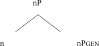 In English, where proper names occur in compounds, the proper name is recognized as such.Footnote 7 Ghomeshi & Massam (Reference Ghomeshi, Massam, Ghomeshi, Paul and Massam2009), discussing examples such as Nixon hater, point out that since this is so, the features that are responsible for this must be located at the level of the NP/nP. To explain this, they distinguish between different flavors of n, namely common n vs proper n.