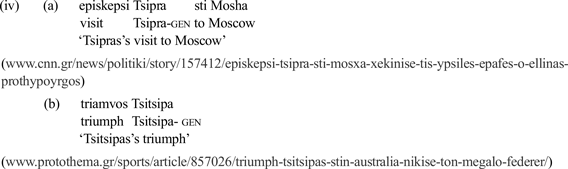 The second issue that will concern me here relates to the additional ways a proper name may combine with another noun in the two languages: in English, next to the PNC there are two genitival constructions, the so-called Saxon genitive as well as post-nominal genitive, e.g. Kerry's supporter, supporter of Kerry and Kerry supporter. In Greek only the post-nominal genitive is available, (7a–b), whereby, as just mentioned and as we will see in detail, the nominalization behaves differently from the phrasal compound; alternatively, the adjectival formation in (7c) can also be employed. There are of course differences between all these cases, which I will revisit in section 4.