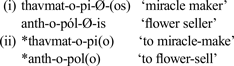 Greek right-headed compounds are subject to the bare stem constraint, according to Ralli (Reference Ralli2013), i.e. the non-head must appear as a bare stem. Ralli uses the label stem in her work to emphasize the fact that in principle this form could not stand in isolation and cannot carry any type of inflectional or derivational morphology. This means that non-heads are morphosyntactically dependent: as Ralli (Reference Ralli2013: 133–4) notes, non-heads disallow both derivational and inflectional suffixes. A derived noun like player is not possible in a compound, as in (10a). Such nouns are categorized as words and have to be part of analytic compounds, as in (10b) (nz = nominalizer).
