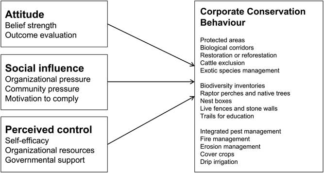 Social science frameworks can improve the effectiveness of sustainability programmes by enhancing understanding of what drives conservation behaviours and informing the development of effective strategies to enhance participation (Bennett et al. Reference Bennett, Roth, Klain, Chan, Clark, Cullman and Epstein2016). Understanding motivations to adopt voluntary conservation practices is a key to better policy (Potoski & Prakash Reference Potoski and Prakash2013). The well-used theory of planned behaviour (TPB) (Ajzen Reference Ajzen1985) establishes that personal behaviour depends on behavioural intention that is predicted by three constructs: (1) attitude towards the behaviour, which refers to the sum of a person’s positive or negative evaluations of performing the behaviour; (2) subjective norm, which reflects the sum of the perceived desire of significant others to approve or disapprove of a particular behaviour; and (3) perceived behavioural control, which is related to the sum of perceptions of internal and external constraints on performing a behaviour. This framework has been widely applied when exploring individual environmental behaviours (Aguilar-Luzón et al. Reference Aguilar-Luzón, García-Martínez, Calvo-Salguero and Salinas2012, López-Mosquera & Sánchez Reference López-Mosquera and Sánchez2012), as well as farmer and rancher conservation behaviours (Dolisca et al. Reference Dolisca, McDaniel, Shannon and Jolly2009, Willcox et al. Reference Willcox, Giuliano and Monroe2012, Mastrangelo et al. Reference Mastrangelo, Gavin, Laterra, Linklater and Milfont2013, Brain et al. Reference Brain, Hostetler and Irani2014). It also has been used to explore managers’ attitudes towards environmental management within organizations (Cordano & Frieze Reference Cordano and Frieze2000, Flannery & May Reference Flannery and May2000, Papagiannakis & Lioukas Reference Papagiannakis and Lioukas2012).