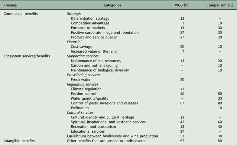 The respondents identified many positive outcomes associated with the adoption of conservation practices (Table 1). These ranged from financial and strategic drivers to the benefits of ecosystem services. Positive corporate image was the most frequent strategic driver. Some WCB respondents linked conservation with positive corporate image and product quality (protecting nature maintains a terroir, which gives identity to the wine and an image to sell). Both groups mentioned the financial driver of cost savings related to the ecosystem service of pest and disease control. Increasing profit was not mentioned as a direct motivation for engaging in conservation practices.