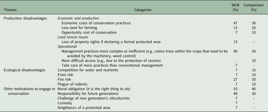 Table 2 Negative outcomes and other motivations associated with the adoption of conservation practices as reported by managers. WCB=Wine, Climate Change and Biodiversity Programme