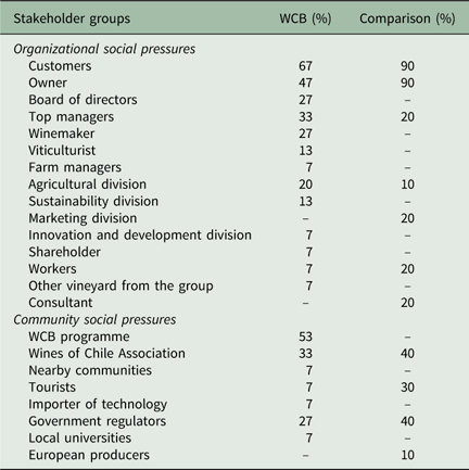 Table 3 Positive social pressures for implementing sustainability and conservation practices from different stakeholder groups related to the organization and from the community. WCB=Wine, Climate Change and Biodiversity Programme
