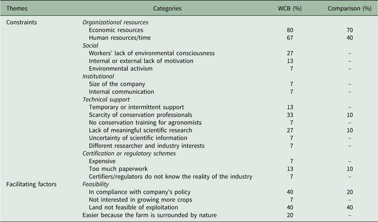 Table 4 Perceptions of constraints and facilitating factors for conservation. WCB=Wine, Climate Change and Biodiversity Programme