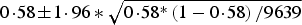 $0\!\cdot\!58 \!\pm \!1\!\cdot96 \ast\sqrt {0\!\cdot\!58^{\ast}\left( {1 - 0\!\cdot\!58} \right)/9639} $