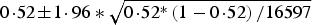 $0\!\cdot\!52 \!\pm \!1\!\cdot96 \ast\sqrt {0\!\cdot\!52^{\ast}\left( {1 - 0\!\cdot\!52} \right)/16597} $