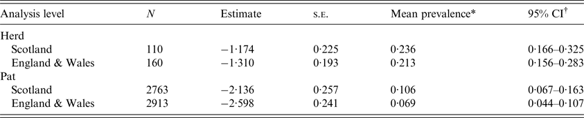 Although there were no historical studies for England & Wales to be integrated into an analysis, and hence no requirement to model complex sampling structures, a similar implementation of the same approach to calculating farm and pat-level prevalence was adopted for these data. For England & Wales, a generalised linear mixed model was fitted, with a random ‘farm’ effect to model extra-binomial variability.