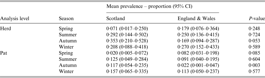 The mean pat-level prevalence (95% CI) of E. coli O157 was estimated at 0·106 (0·067–0·163) for Scotland and 0·069 (0·044–0·107) for England & Wales (Table 1). The difference between Scotland and England & Wales was not statistically significant (P = 0·19). Within surveys, there was no difference in seasonal pat-level prevalence in England & Wales (P = 0·60), but in Scotland spring estimates were lower than estimates for the other seasons (P < 0·05) (Fig. 1). Between surveys, the pat-level prevalence in the autumn was low in England & Wales in comparison to Scotland (P = 0·003) (Table 2 and Fig. 1).