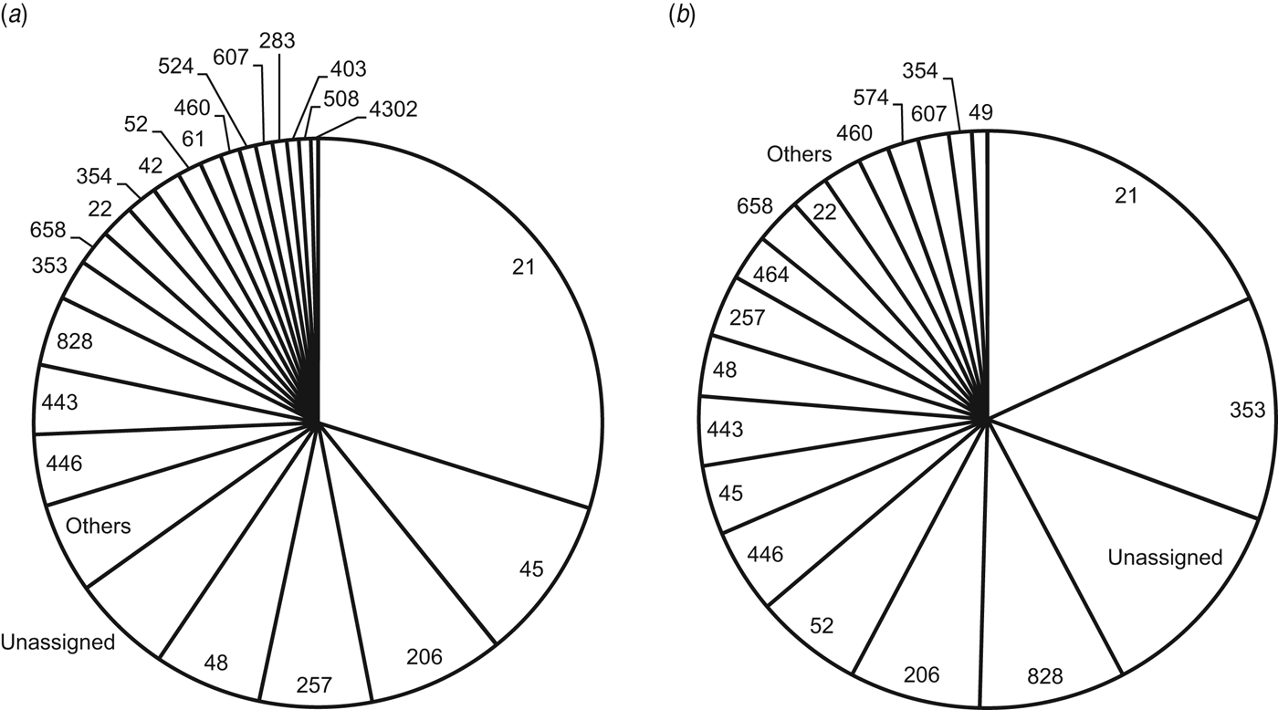 Fig. 1. Sequence types identified in Campylobacter jejuni/coli isolates from (a) 737 non-travellers (infections acquired in The Netherlands) and (b) 232 travellers returning to The Netherlands. Category ‘others’ includes sequence types that occurred less than five times (non-travellers) and less than twice (travellers).