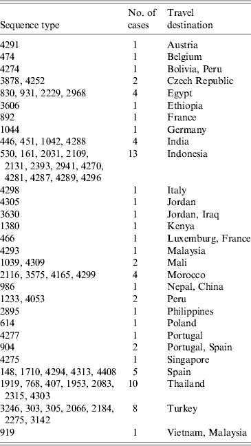 Table 2. Sequence types found exclusively in travellers returning to The Netherlands but not in cases acquired in The Netherlands, nor in any of the sourced animal and environmental reservoirs