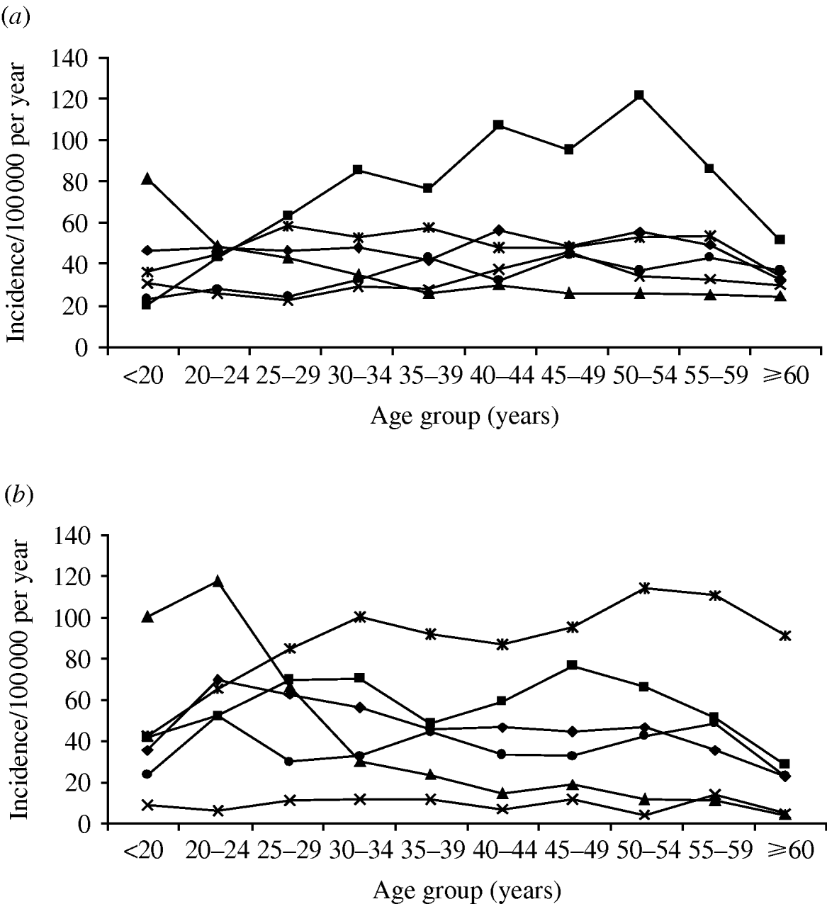 Fig. 2. The incidence by age group and National Statistics – Socioeconomic Class (NS-SEC) of indigenous Campylobacter jejuni infection in (a) males and (b) females in the Campylobacter Sentinel Surveillance Scheme population (n=8261), England and Wales, May 2000 to April 2003. –◆–, Managerial and Professional; –■–, Intermediate; –▲–, Small Employers and Own Account; –×–, Lower Supervisory and Technical –