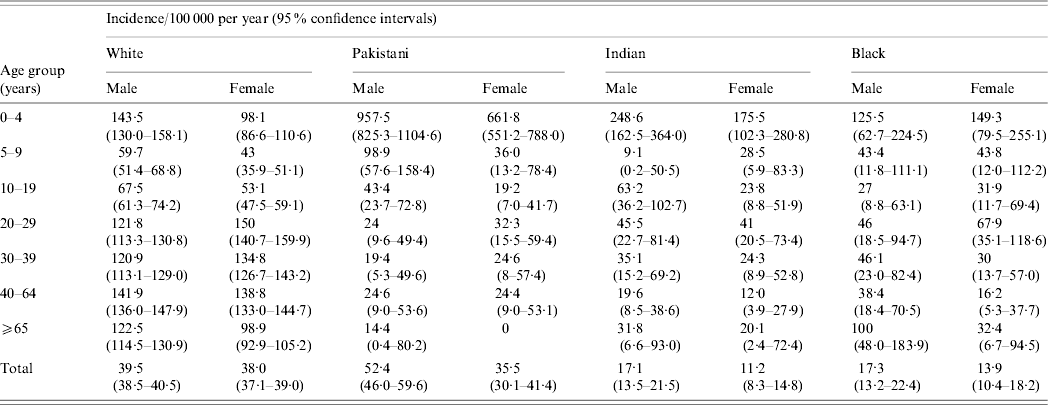 Patient age and gender was available for 12 309 of 12 327 cases (99·9%) in the ethic groups (White, Pakistani, Indian and Black) where numbers were sufficient for further analysis (Table 1). The incidence in male Pakistanis aged 0–4 years was higher than in female Pakistanis in this age group and than any of the other age/gender groups in the studied ethnic groups. In white males, the incidence was greater than in females at 0–4 years, 5–9 years and 10–19 years, but not at 20–29 years. In the resident Indian and Black populations no significant differences by age and gender were observed.