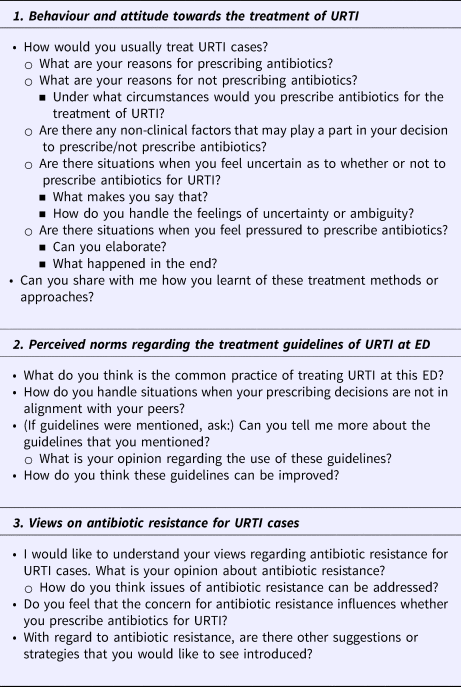 In-depth interviews (IDIs) were conducted with purposively sampled physicians working in the busiest adult ED in Singapore. The ED at the 1600-bed Tan Tock Seng Hospital attended to an average of 450 patients daily. Physicians were the only healthcare providers who prescribed medications for patients. A semi-structured interview guide (Table 1) was developed and piloted with two senior physicians for comprehensiveness and acceptability for use. The interview guide explored participants’ knowledge and behaviours towards URTI treatment, perceived norms of managing URTIs, and views on antibiotic resistance. Demographic data of participants such as age, gender, country of basic medical training, years of clinical practice and current position were also collected.