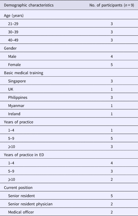 In Singapore, URTI is the leading condition managed at primary care clinics, accounting for one-quarter of consultations [28]. Despite the presence of highly accessible primary care clinics in the community, URTIs accounted for a substantial proportion of attendances at EDs and were associated with frequent ED attendances [Reference Paul29]. Approximately 24% of adult patients with URTIs in EDs were inappropriately prescribed antibiotics [Reference Aabenhus30]. Despite this substantial proportion of inappropriate antibiotic prescribing there is a lack of qualitative studies in countries with highly accessible primary care clinics that can help provide an in-depth and comprehensive understanding of the determinants of antibiotic prescribing in the ED. To date, only one study has attempted to examine factors associated with antibiotic decision-making by ED physicians using qualitative methods [Reference May19]. The study was conducted in the USA where EDs served as safety nets for vulnerable populations with limited access to primary care [Reference Hsia, Kellermann and Shen31]. The findings might not be applicable in countries such as Canada, France, UK, Saudi Arabia, Australia and Singapore, where there is good primary care coverage [Reference Pines32].