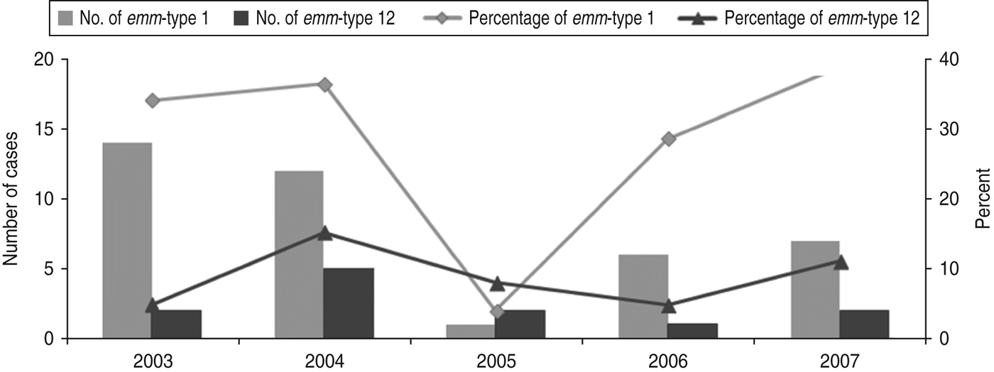 A total of 138 strains were emm-typed successfully and assigned to 31 different emm-types. Overall, the most common emm-types (with a predominance of ⩾5%) were emm-types 1 and 12 (28·2 and 8·5%, respectively), together comprising over a third of all isolates. As shown in Figure 1, the proportion of infections due to emm-type 12 remained relatively stable during the whole study period. In contrast, that of emm-type 1 fell sharply (P = 0·026) in 2005, rising gradually to reach its 2003 levels, by 2007.