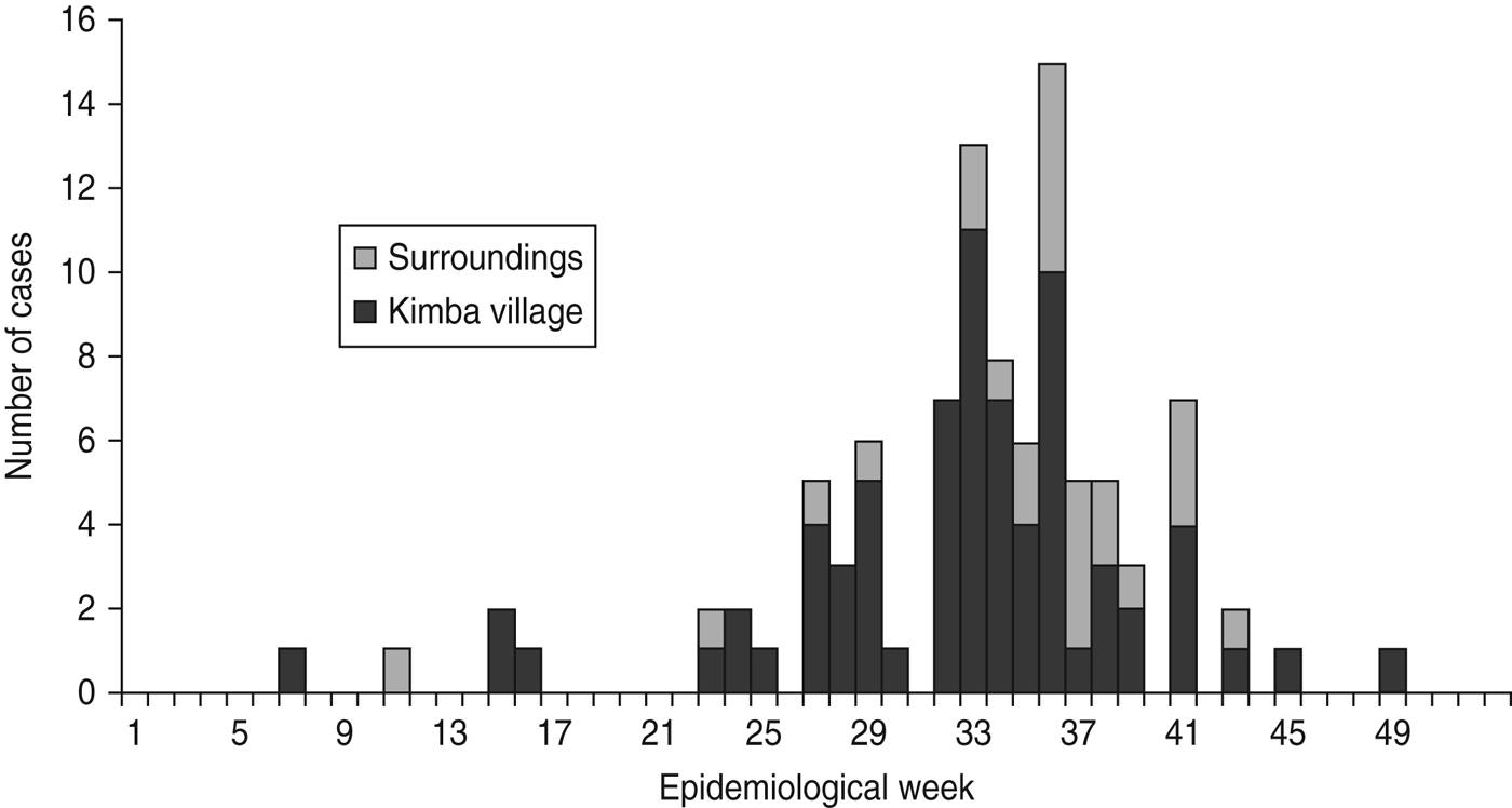 Each of the 140 households of Kimba village was interviewed; the total population was 1553 persons. In the surrounding settlements, village elders identified 38 households in which at least one person had suffered the symptoms listed in the case definitions. One respondent in each of these 38 households was also interviewed. Hereafter, ‘Kimba’ refers to the village of Kimba and its surrounding settlements, unless otherwise specified.
