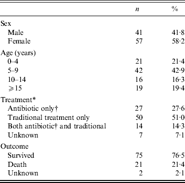 The first probable diphtheria case occurred in February 2011. Cases continued until November 2011, with the highest weekly incidence occurring between weeks 32 and 36 (Fig. 1). Seventy-three (74·5%) of the cases were identified in Kimba village proper, corresponding to an attack rate of 4·7% over a 10-month period in the village. Characteristics of cases are presented in Table 1. Only 4/98 cases (4·1%) reported ever having received even a single dose of diphtheria vaccine prior to February 2011. The majority (51·0%) of all cases reported being treated exclusively with traditional products, either by self-medication or in consultation with a traditional healer.