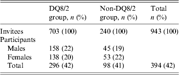 The parents of all children currently participating in the MIDIA cohort were invited to participate in this sub-study, with the aim of investigating possible associations between E. vermicularis and allergies, wheezing and atopic eczema. The numbers and characteristics of the invitees and the participants in this sub-study are given in Table 1. A flow diagram depicting the study participants of the MIDIA study and this sub-study is given in online Supplementary Figure S1. The children in the DQ8/2 group comprised 75% of the participants in the study, while the non-DQ8/2 genotype was carried by 25% of the participants. The compliance was similar by gender, and in the DQ8/2 and non-DQ8/2 groups. The children's age ranged from 2 to 11 years, with most being aged <6 years. The study was approved by The Regional Committee for Medical and Health Research Ethics South East A and the Norwegian Data Inspectorate, and written informed consent to participate in the MIDIA study was given by the parents.