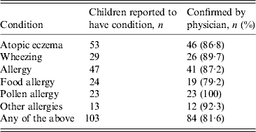 Table 2. Percentage of atopic conditions confirmed by a physician