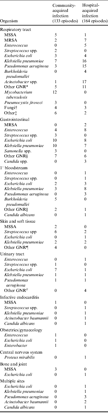 Table 2 shows that community-acquired infections occurred in 173 (44·4%) of patients and that patients with hospital-acquired infections had higher hospital mortality than those with community-acquired infections (57·1% vs. 40·5%, P=0·001). The respiratory tract was the most common site for both community- and hospital-acquired infections and septic patients with a primary bloodstream infection were more likely to die than patients with other sites of infection. Patients who survived had significantly more urinary tract and obstetrics/gynaecological infections. Other sites of infection were not significantly different between the survivor and non-survivor groups. Multiple sites of infection were involved in seven hospital-acquired infection patients. Blood cultures were positive in 106 (27·5%) patients but the incidence of bacteraemia was not different between the community- and hospital-acquired infection groups (47·2% vs. 52·8%, respectively). Microorganisms were isolated from 241 patients (61·8%), including 66·7% of community-acquired infection cases and 58% of hospital-acquired infection cases. The most frequent organisms were Klebsiella pneumoniae (19·9%), Escherichia coli (14·1%) and Pseudomonas aeruginosa (9·1%) (Table 3). Gram-negative bacteria predominated in 68% of cases whereas Gram-positive species were found only in 19·9% of samples. Mixed infections accounted for 56 (23·2%) patients and those with hospital-acquired infection had a higher incidence of mixed infections than patients with community-acquired infection (18·3% vs. 9·4%, P=0·013).