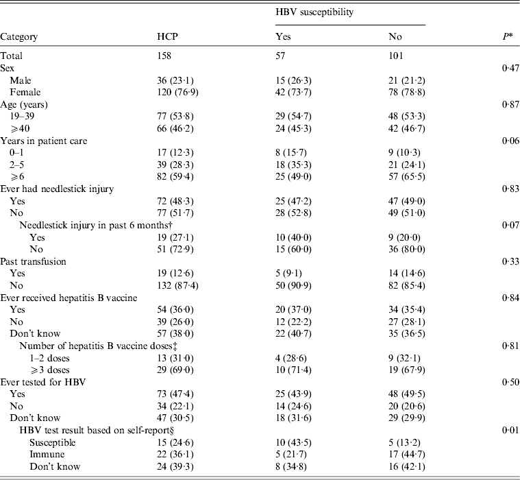 ‡ For statistical testing of significant differences between HCP participants and non-HCP participants using Pearson's χ 2 test, categories with greater than two levels were collapsed into two levels. These were: years in patient care = 0–5 years and ⩾6 years; ever received HB vaccine and ever tested for HBV = yes and no/don't know; HBV test result based on self-report = susceptible and all others; and HBV status based on serological testing = susceptible and all others.