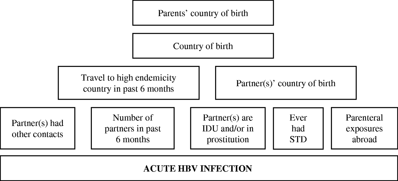 Fig. 1. Conceptual hierarchical framework for risk factors for acquisition of HBV infection among adult females and adult heterosexual men in The Netherlands.