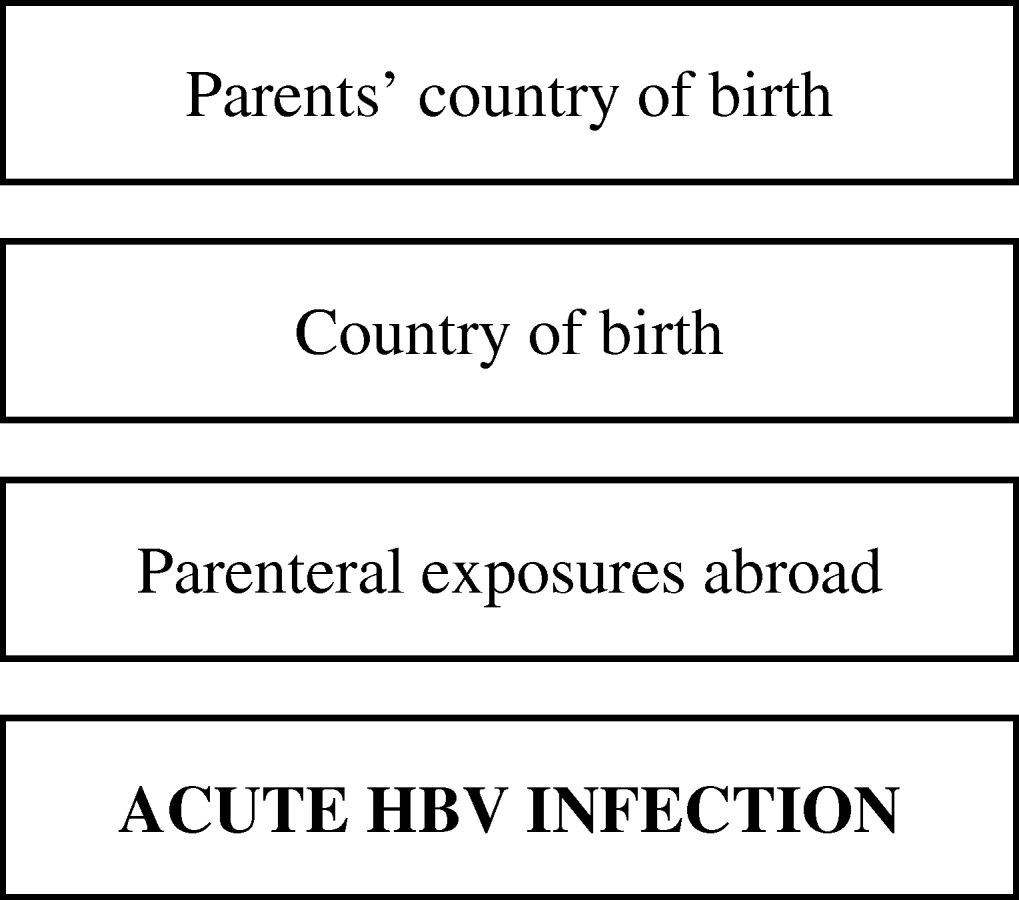 Fig. 2. Conceptual hierarchical framework for risk factors for acquisition of HBV infection among individuals aged <18 years in The Netherlands.