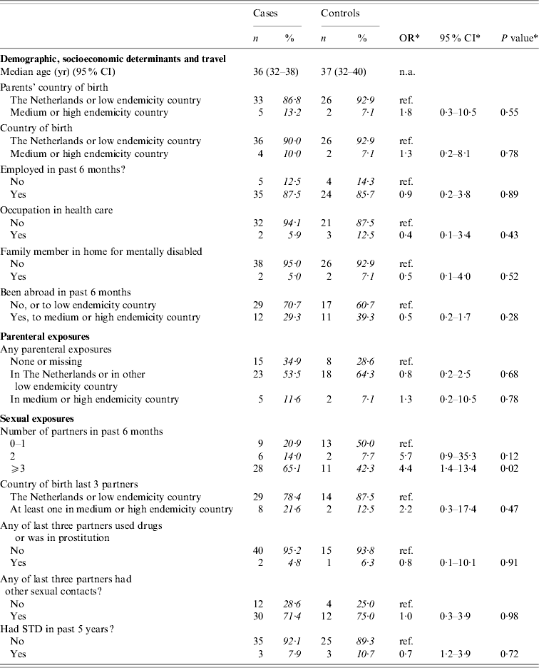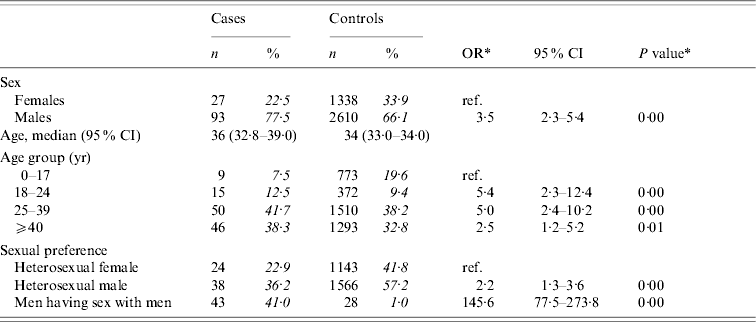 Table 3. Cases of acute HBV infection in men who reported to have (had) sex with men (MSM): distribution of demographic characteristics with corresponding odds ratios (OR) and 95% confidence intervals (CI)