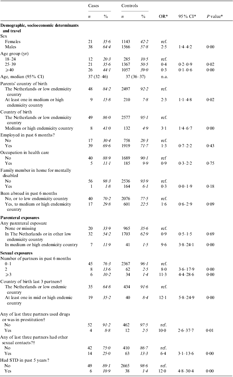 To adjust for oversampling of men and those aged 20–39 among controls, weights were used in all univariate analysis. Cases were assigned a weight of ‘1’. For controls, weights were chosen such that the age group and sex distribution among controls would fit that of the Dutch population in 2000 (http://statline.cbs.nl/). To adjust for oversampling individuals with a partner of non-Dutch nationality and/or multiple partners among controls invited to fill out the second questionnaire, a second weighing factor was introduced. Its value was calculated such that after weighing the frequency of those with a non-Dutch and/or multiple partners among those completing the second questionnaire matched this frequency among controls who completed the first questionnaire.