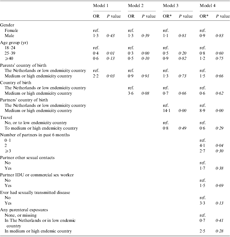 Figure 1 shows the conceptual hierarchical framework for adult female and heterosexual male cases, built with determinants which were associated (P<0·1) with the risk of acute HBV on univariate analysis. Table 2(b) lists the ORs resulting from the multivariate analyses. Model 1 indicated that descending from at least one parent born in a medium or high endemicity area for HBV is a significant risk factor for acquisition of HBV. However, the strength of this association decreases and becomes insignificant when ‘country of birth’ is added in a second model. In the third model, country of birth of partners and travel in the past 6 months were added. This showed that having a partner born in a medium or high endemicity country was a highly significant risk factor. Travel was not significant. In this model, the OR for country of birth decreased (from 3·6 to 0·7). On separate testing, it was found that this was largely explained by adding the country of birth of partners (results not shown). In the fourth model, the number of partners, risk behaviour of partners and parenteral exposures in medium or high endemicity countries was added. Only having two partners in the past 6 months was significant. In this model, the OR for having a partner from an endemic area fell to 8·9. On separate testing, this fall could largely be explained by adding the variables number of partners and having had an STD in the past (results not shown).