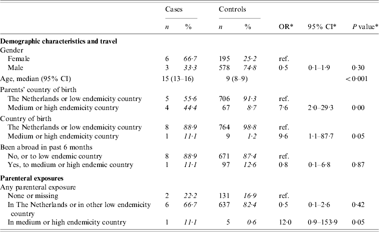 There were nine cases and 773 controls aged <18 years of age. Three of the cases reported heterosexual contact as the most likely route of transmission. Information on sexual contact was not available for controls. Table 4(a) presents crude ORs for demographic and parenteral exposures for those aged <18 years. Having at least one parent born in a medium or high endemicity country, being born in such a country, and parenteral exposure in such a country were associated with infection. Travel to a medium or high endemicity country was no more frequent among cases than among controls.