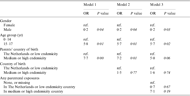 Figure 2 shows the conceptual hierarchical framework for participants aged <18 years, built with determinants which were associated with the risk of acquisition of HBV on univariate analysis (P<0·1). Table 4(b) lists the ORs resulting from the multivariate analyses. Model 1, including ‘age’, ‘gender’ and ‘parents’ country of birth’, showed that having one or both parents born in a medium or high endemicity country significantly increased the risk of acquisition of HBV. The second model added ‘country of birth’, which was no longer significant. A subsequent model added parenteral exposures abroad. This made the OR for ‘parents’ country of birth’ decrease, suggesting that part of the effect of the country of birth of the parents is explained by an increased frequency of parenteral exposures in medium or high endemicity countries in children with parents born in a HBV-endemic country compared to those with parents born in a non-HBV endemic country.