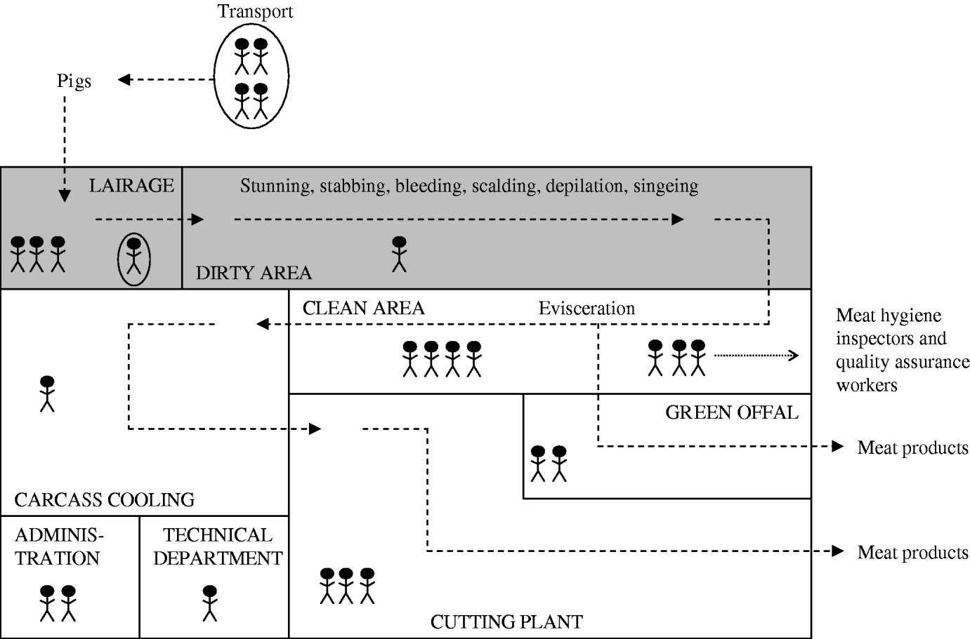 Fig. 1. Schematic representation of the sections of the production chain (dotted lines) in a pig slaughterhouse. The shaded area represents sections where live pigs are located (dirty area). Each human figure represents about 10 persons, circled persons are not actual slaughterhouse employees (livestock transport workers and official veterinarians and auxiliaries).