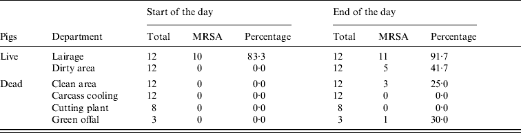 There is a significant association between the presence of MRSA in different sections, and the percentage of MRSA-positive persons working in these relevant sections. It is possible that acquisition of MRSA occurs through contaminated surfaces [Reference Boyce39]. However, presence of MRSA on different surfaces does not necessarily imply that there is an increased risk of human MRSA acquisition via the environment: where the lairages have a high percentage of MRSA-positive samples at the end of the day (92%), a relatively low percentage of lairage workers had acquired the bacterium (6·3%). It is plausible that animals spread MRSA to both humans and the environment, and human acquisition of MRSA seems to be more likely by contact with MRSA-positive animals than through environments with MRSA in dust or aerosols.